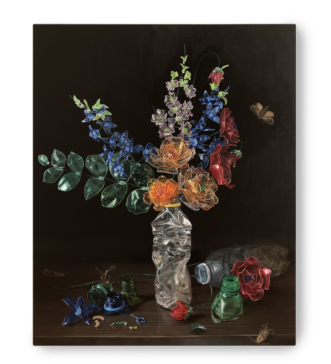 Le travail d’Aymeraude du Couëdic explore les tensions entre contrôle et liberté, nature et artifice, en associant rigueur plastique et réflexion critique. Inspirée par les avancées scientifiques, elle cherche une confrontation entre l’esthétisme et l’art engagé. La série Nature mourante détourne les codes de la nature morte : une fleur tente de survivre dans une bouteille en plastique écrasée, métaphore de la banalisation du déchet. Pourtant, au creux de l’ombre, une larve capable de digérer le plastique y introduit une faille dans l’irréversible qui ronge ce que l’homme croyait éternel. Et si la nature trouvait le moyen de réparer ce que l’homme détruit?