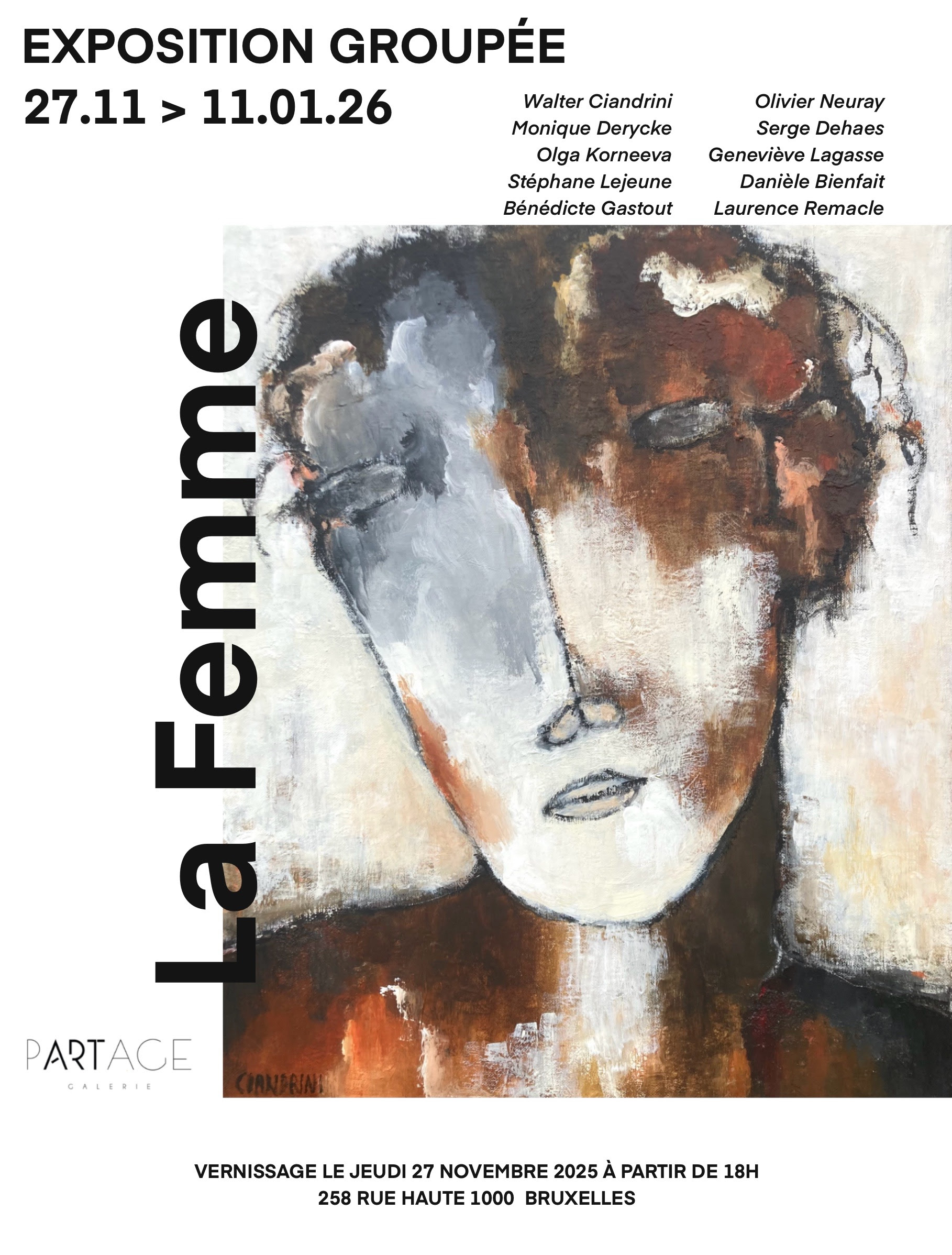 Cet hiver, La Partage galerie à été heureuse de vous offrir une exposition spéciale fête où le petit format est à l’honneur. Des résidents ont été exposés sous des formats bien plus petits que ceux que vous pouviez voir habituellement chez Partage Galerie, avec Diego Menendez artiste depuis sa plus jeune enfance, qu’on ne vous présente plus, dont le style rappel celui de l’expressionnisme, avec des couleurs chaudes, des visages anguleux, et une expression du corps poétique. Carlos Vivar, artiste mexicain, aux couleurs intenses et énergiques, rythmées par des éléments figuratifs. Mais aussi des artistes présents pour l’occasion, avec Stéphane Lejeune, et ses corps faits d’encre, à la frontière entre le figuratif et l’abstrait. Michou Marlière, artiste belge, aux inspirations diverses dont les pinceaux s’invitent à la fois entre ses mains et sur sa toile. Olivier Neuray, un bédéaste, aux multiples talents, explorant avec une grande délicatesse le quotidien de femmes, dans sa série de gravure. Catherine Van de Woestyne, à la limite entre l’abstrait et le figuratif, offrant des paysages monochromes et texturé qui emmènent dans un monde onirique. Et pour finir, Michelle Dechamps, artiste touchante, dévoilant son regard singulier sur l’intimité et le corps de la femme, le tout appuyé par la technique du fusain.